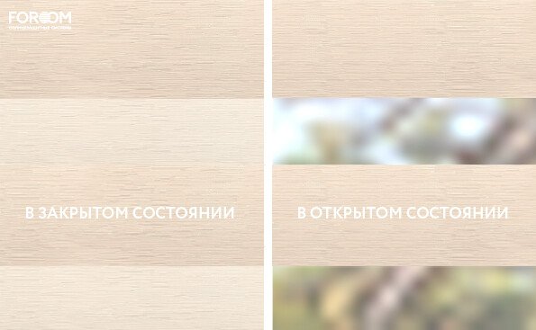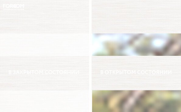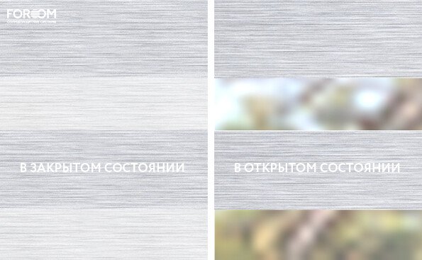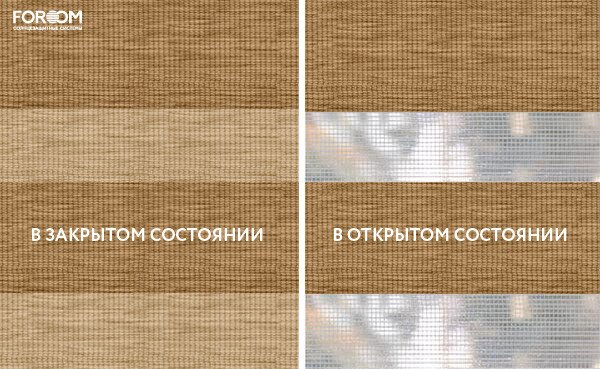 Полотно ткани, состоит из чередующихся горизонтальных полос – прозрачных и непрозрачных. Изменяя положение этих полос относительно друг другу, можно создать целых 3 режима регулировки светом. Например, чтобы в помещении стало светлее, нужно расположить прозрачные полосы друг напротив друга. Если разместить прозрачную и непрозрачную полосу параллельно друг другу, то можно добиться практически полного затемнения.